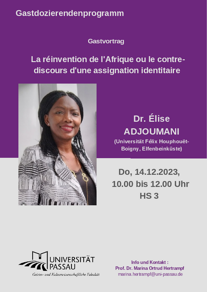 - 10-12 Uhr in Hörsaal 3 den Vortrag „La réinvention de l'Afrique ou le contre-discours d'une assignation identitaire“ halten (siehe Plakat).