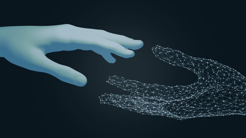 A concept depicting a human hand and an AI-powered network hand reaching out to connect, showcasing the union of humanity and advanced technology in a futuristic digital world. 3d rendering