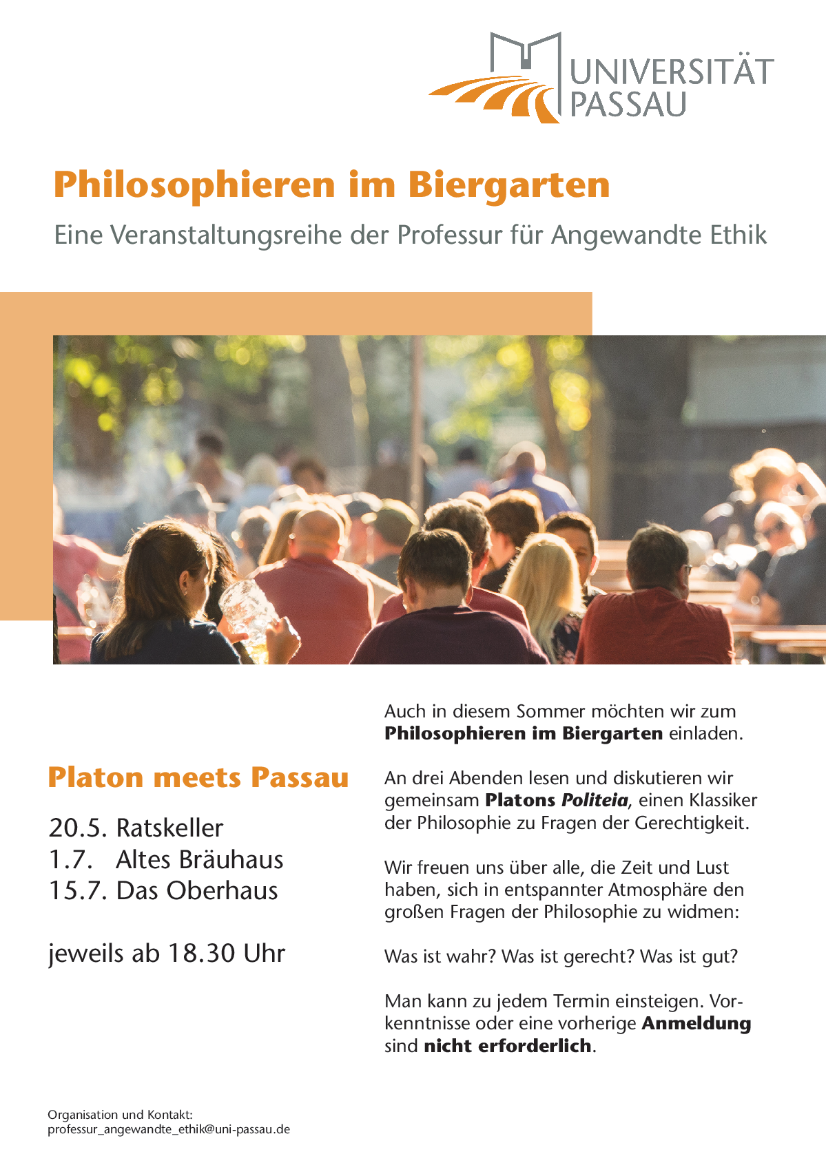 Im Sommersemester veranstaltet die Professur für Angewandte Ethik die Reihe „Philosophieren im Biergarten“. In verschiedenen Biergärten der Stadt sind alle Interessierten eingeladen, sich zu philosophischen Themen und Positionen auszutauschen: Was ist Freiheit? Was ist gerecht und gut? Texte und Moderation werden von Studierenden und der Professur vorbereitet. Eine Anmeldung oder Vorkenntnisse sind nicht erforderlich.