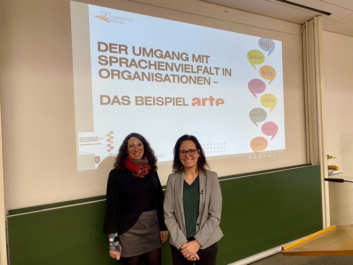 As part of the lecture Introduction to Intercultural Communication and Intercultural Management, which is hold by PD Dr. Martina Maletzky de García (on the left), an exciting guest lecture by Birgit Gabriel took place on 14 January 2026. Under the title ‘Dealing with linguistic diversity in organisations – the example of ARTE’, she gave students a practical insight into the linguistic and cultural diversity of the European cultural broadcaster ARTE.