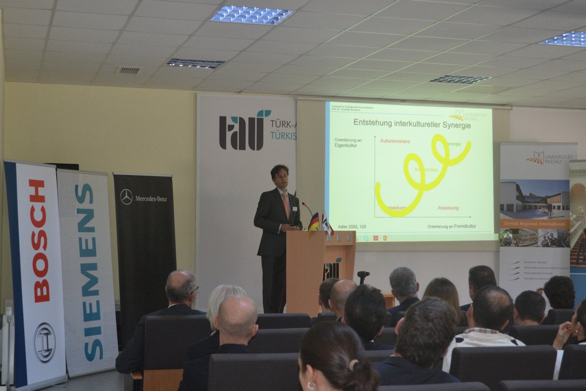 Professor Barmeyer and Barbara Agha-Alikhani took part in the 'Wissenschaft trifft Wirtschaft im interkulturellen Dialog' Symposium organised by Professor Ernst Struck at the Turkish-German University (TDU) Istanbul from 19th-21st October 2014. The aim of the symposium was to look at new phenomena and developments in intercultural management from a practical as well as research-oriented perspective, and at the same time to promote Turkish-German dialogue between students, researchers and managers of both countries. Representatives from business and politics were present for this purpose, as well as scholars from the partner university in Passau, who teach at the TDU in the 'Intercultural Management' (IKM) master's programme.<br/>On the second day of the symposium, participants were invited to company tours at Mercedes-Benz Turkey and SIEMENS. A joint closing event summarised the findings from research and industry. Full programme<br/>Professor Barmeyer gave his talk 'Interkulturelles Management: Praxis, Forschung und aktuelle Themenfelder' on the Tuesday and moderated the visit to SIEMENS on the Wednesday.