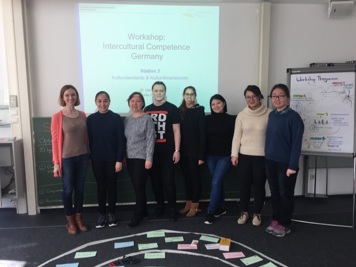On the 25th March 2019, Marcella Poguntke (left in the photo) gave a workshop on intercultural competence in Germany as part of the German Week for students of the Language Centre’s programme Academic German Year. The students came from very different cultures: China, Russia, Mongolia, Venezuela, Brazil, Ecuador, Costa Rica and South Korea.<br/>On a journey through four interactive sections, the students discovered together what culture is, how it expresses itself in thought and action and, above all, how one’s own cultural orientation influences one’s perception of German culture.<br/>Among other things, the participants developed the 'onion model of culture' which, layer by layer, gave rise to a colourful picture of German culture from different perspectives through their impressions and experiences. Not only did the participants learn about the background of German cultural peculiarities, but they also discussed this in relation to their own cultures. Finally, they learned from a professional case study how to deal constructively with interculturality and how to make positive use of cultural differences.