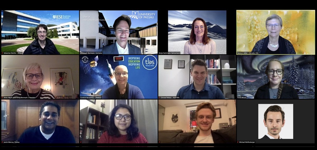 Professor Christoph Barmeyer participated as a presenter and discussant in the panel (11.12.2020) and workshop (12.12.2020) "Dealing with the Pandemic: Learnings across Nations from Culturally Informed Leadership", organised by Professors Nancy Adler, McGill University, and Sonja Sackmann, Universität der Bundeswehr, as part of the international online EIBA conference. Intercultural Scholars from different countries reported on the situation and measures in their countries: Bangladesh (Marufa Akter Mimi), Denmark and Sweden (Anne-Marie Søderberg), Germany (Christoph Barmeyer), France (Cordula Barzantny), United Kingdom (Fiona Moore), Italy (Giovanna Magnani), Austria (Christof Miska), Rwanda (Jeremy Solomons), Spain (Sebastian Reiche), Switzerland (Sonja Sackmann), Turkey (Justin Marcus) and USA (Nancy J. Adler). In the discussions it became apparent how differently (successfully) countries deal with the pandemic on an institutional as well as on a cultural level (values and social practices). Topics discussed were political leadership (democratic versus autocratic); freedom (health versus economy, role of data protection); trust in political systems, politicians, scientists, technical progress (vaccines); global access to vaccines (humanism), intercultural learning and social good practices; social entrepreneurs as global intercultural bridge builders. The screenshot shows most of the discussants.