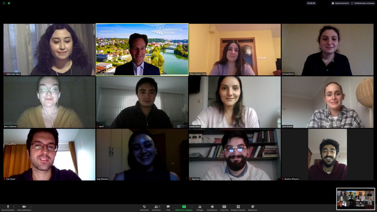 As every year, Madeleine Bausch and Professor Christoph Barmeyer taught two courses ("Introduction to Intercultural Communication" and "Intercultural Management") in the master’s program "Intercultural Management" at the Turkish-German University in Istanbul. Due to the corona pandemic, teaching took place in digital space. Thanks to lively discussions and group work on interculturality in organizations, a high level of interactivity could be achieved, despite the online format. As in previous years, the courses included presentations by guest speakers: Clemens Blanke, Marketing Manager of the company UZAY KIMYA SAN presented intercultural challenges in international sales of cleaning products and addressed the topic of intercultural collaboration in a Turkish family business. Claudia Salvischiani, working at the management consultancy Beyond Scaling, inspired the students with a lecture about career and self-development. The screencast shows the students of the current year.