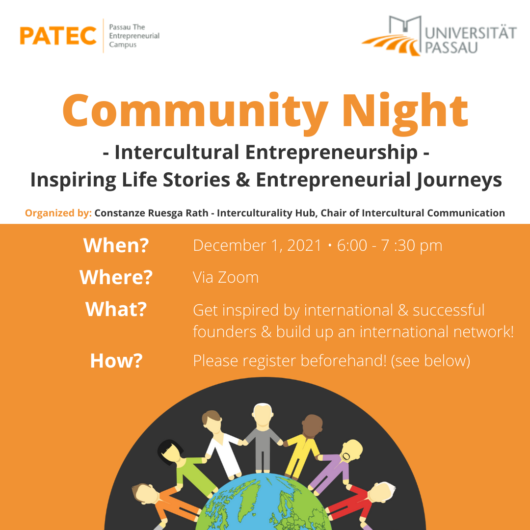 On December 17, 2020, the first Community Night of the Interculturality Hub on the topic of “Intercultural Entrepreneurship“ was organized by Constanze Ruesga Rath within the project PATEC - Passau the Entrepreneurial Campus.