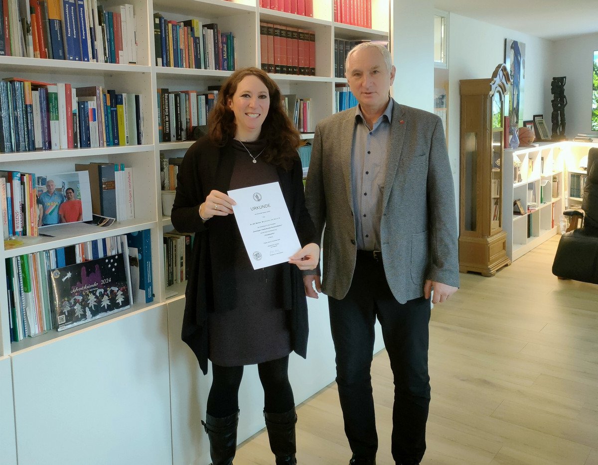 On December 11, 2024, Dr Maletzky de García was awarded the authorisation to teach (Lehrbefugnis) in the subjects of sociology and intercultural communication by the President of the University of Passau, Prof. Dr. Ulrich Bartosch. This is the result of a comprehensive habilitation on the topic of mobility in the organisational society, in which Dr Maletzky de García examined the penetration of organisational principles in migration discourse and showed that in the German context, migration is increasingly discussed in terms of the principles of rationality, economic benefit and efficiency, which contributes to a two-tier structure of migrants and a neglect of socio-ethical foundations.