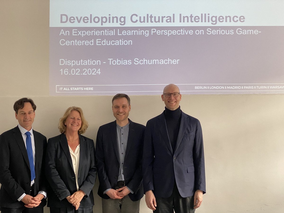 On February 16, 2024, Professor Christoph Barmeyer took part in the defense of Tobias Schumacher's dissertation at ESCP Berlin as a second reviewer at the invitation of his first supervisor, Professor Marion Festing. The starting point for the dissertation "Developing Cultural Intelligence. An Experiential Learning Perspective on Serious Game-Centered Education," was to design and test new and innovative didactic forms for teaching intercultural competence, such as intercultural simulation games. A relevant approach of this dissertation is the acquisition and promotion of cultural intelligence through serious games based on experiential learning. Through its conceptual approach, its variety of methods and its original implementation, the work makes an important contribution to research into intercultural competence development and contributes to the mutual transfer of knowledge between theory and practice.
