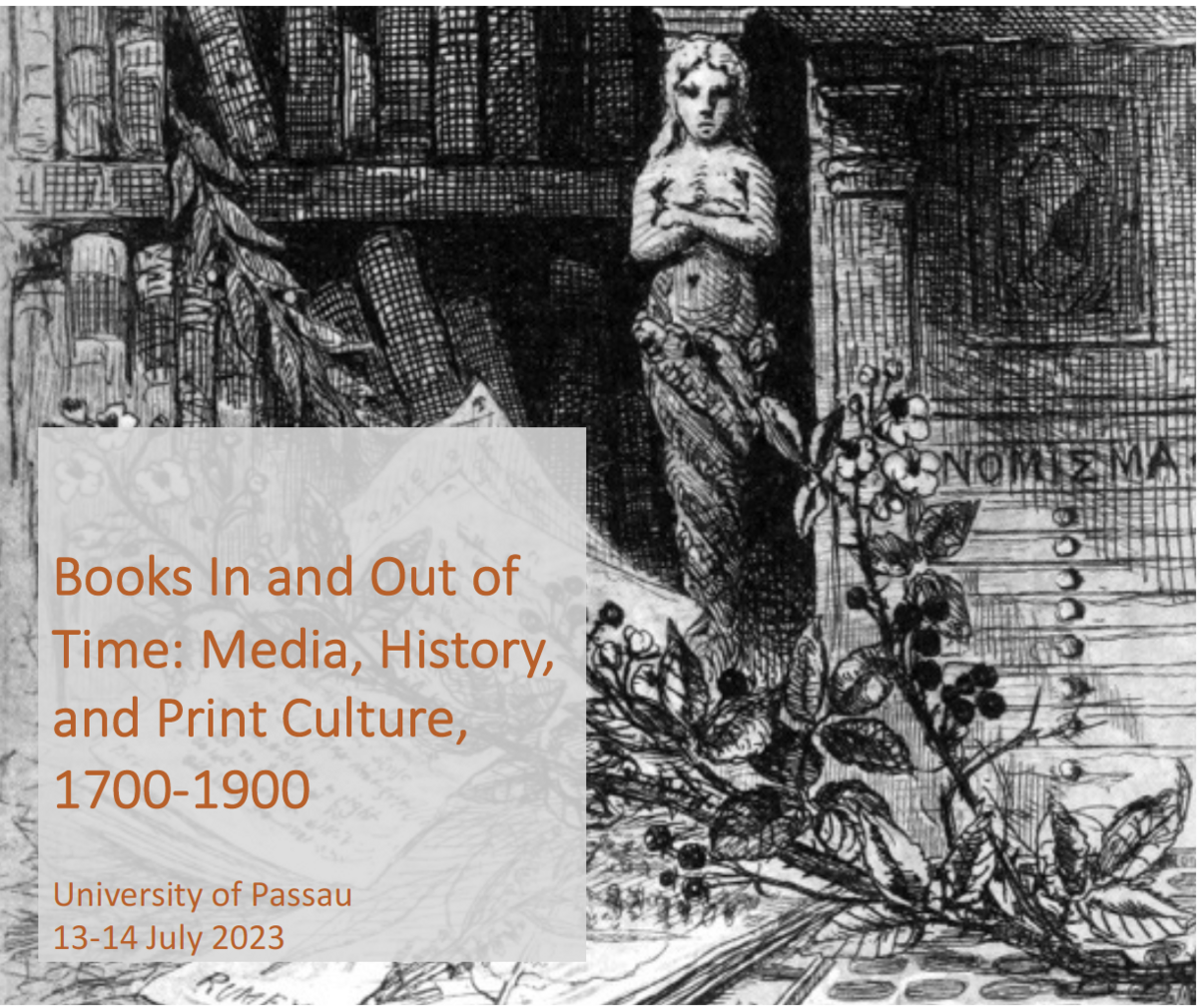 Luisa Calè (Birkbeck), Vicky Mills (Birkbeck) and Katharina Boehm jointly organized the conference “Books In and Out of Time: Media, History, and Print Culture, 1700-1900”, which was held in Passau from 12-15 July 2023. Speakers from the US, UK and Germany discussed the book as a key medium of historical cognition that provided writers and readers with flexible ways of measuring, (re)ordering, and conceptualizing their relationship to different pasts and anticipated futures. Many papers asked how eighteenth- and nineteenth-century authors harnessed new technologies of reproduction, as well the book's capacity to engage with and host multiple media, in order to think about the different temporalities manifested by the material cultures of the book. Here’s the conference Programme.