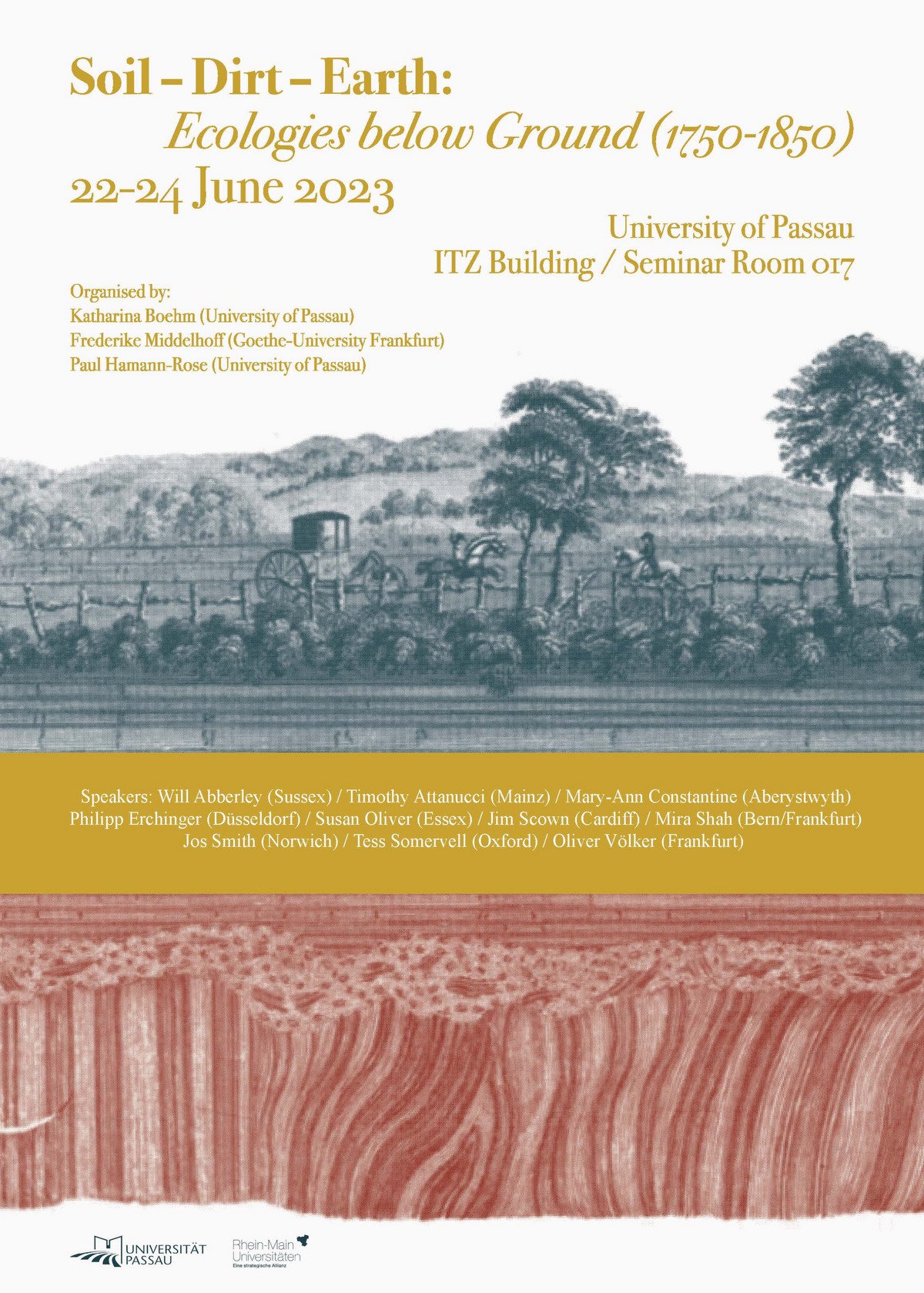 The conference “Soil – Dirt – Earth: Ecologies below Ground, 1750-1850” explored how a focus on (literary and non-literary) figurations of soil, earth, and dirt can help us rethink Romantic and early Victorian perceptions of natural environments and how it might enhance our conception of ecologies. The conference was jointly organized by Katharina Boehm (Passau), Paul Hamann-Rose (Passau), and Frederike Middelhoff (Goethe-Universität Frankfurt). It took place on 22-24 June 2023. You can find the programme here: "Programme".