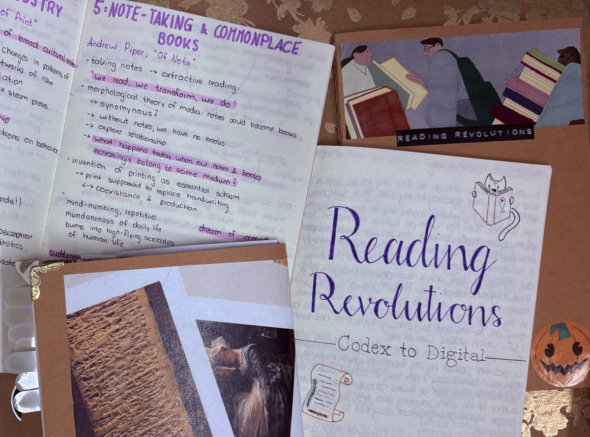 From the invention of the codex and the printing press to the rise of digital media and artificial intelligence, this course explored the profound impact of technological and media revolutions on reading practices, the dissemination of information, and the politics of knowledge. Seminar discussions were flanked by weekly hands-on lab sessions during which students experimented with the some of the media, materials, and technologies that we studied: we examined rare books and ephemera at archives, designed and made commonplace book pages, wrote and sewed pamphlets, researched nineteenth-century scrapbooks and albums, and explored how e-books, automated text generation, and algorithms are currently transforming our understanding of authorship and readership.