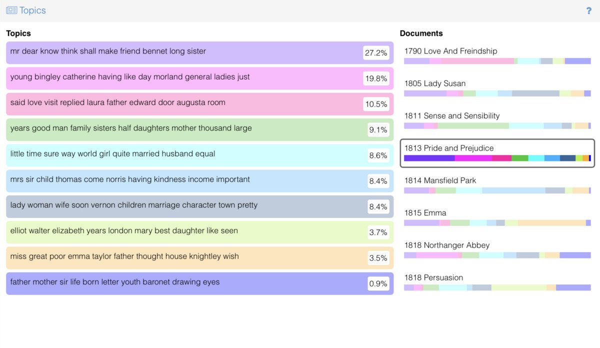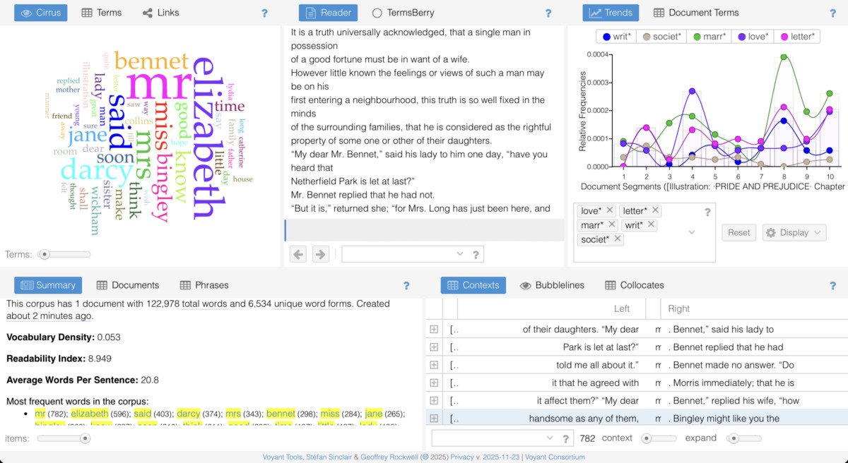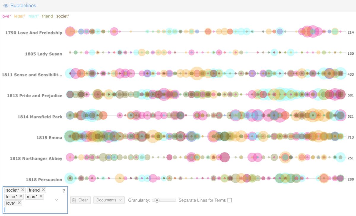 Students experimented with an array of data analysis and visualization tools to reveal textual patterns. Tools included word clouds, word correlations, frequent phrases, word contexts, a list of frequent words, a text reader, trends pane, and summary of findings. Customizing the tools, students visually graphed the frequency of words across the length of the corpus. Taking Jane Austen’s classic novel Pride and Prejudice as one case study, we analyzed textual correlations of family, class, writing, and the marriage plot. By comparing printed books, e-books, and data analysis and visualization interfaces, students explored interactive practices of reading and making meaning across varied technologies. They identified continuities between data analysis and the diverse ways in which they already read and discovered new research methods for future use.