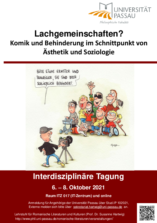 These considerations create individual issues which will be discussed at four theoretical levels during the conference (individual examples, role of the body, normative aspects, comedy criticism). Two discussion rounds with people who have practical experience in this field will help to gauge the practical consequences of comedy in the field of disability. The speakers are representatives from social sciences, educational science, literary, culture, media, theatre and film studies.