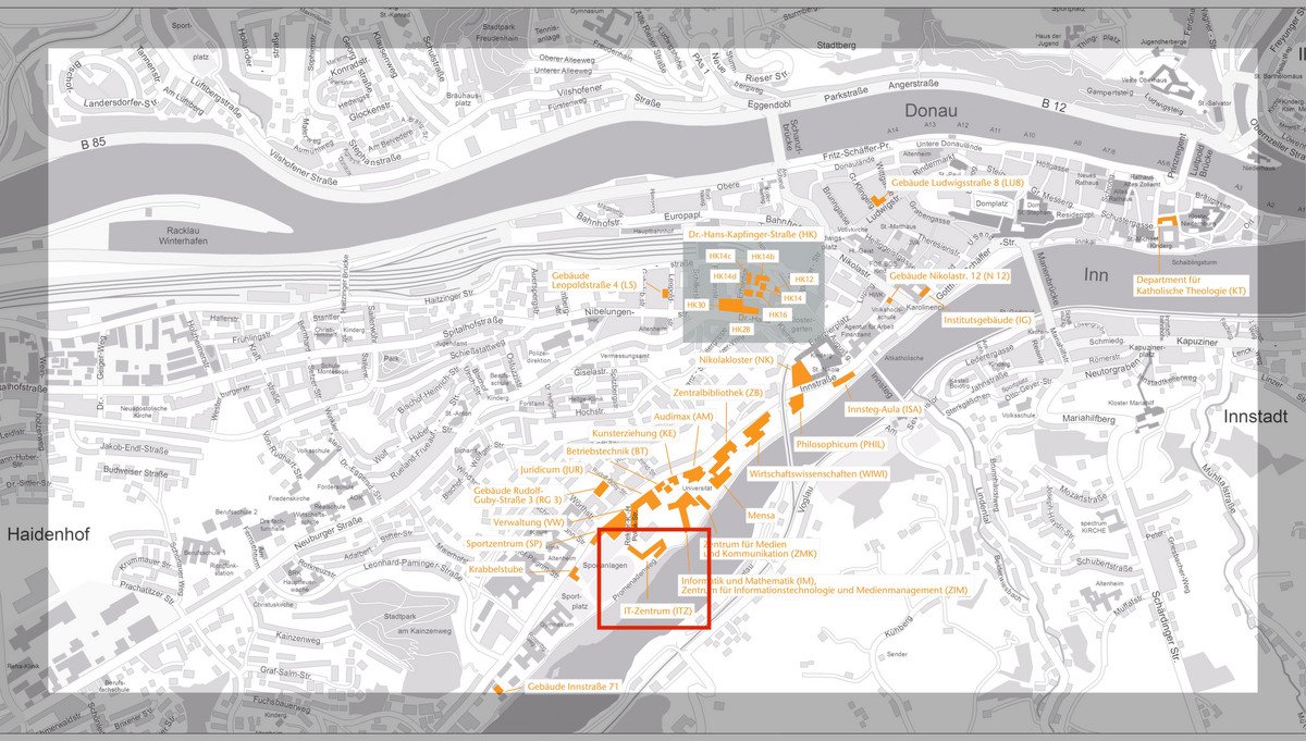 - · From Passau Hauptbahnhof/Main Station: 5 minutes by foot to the university