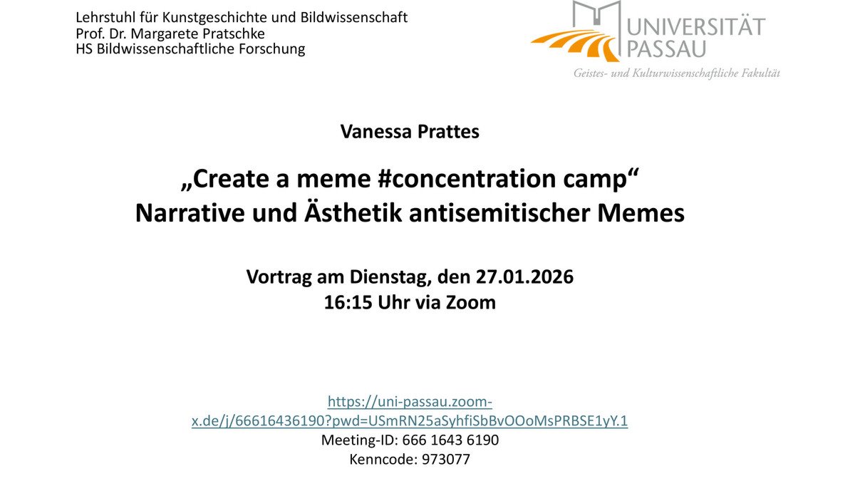 Einladung zum Vortrag von Vanessa Prattes "Create a meme #concentration camp". Narrative und Ästhetik antisemitischer Memes