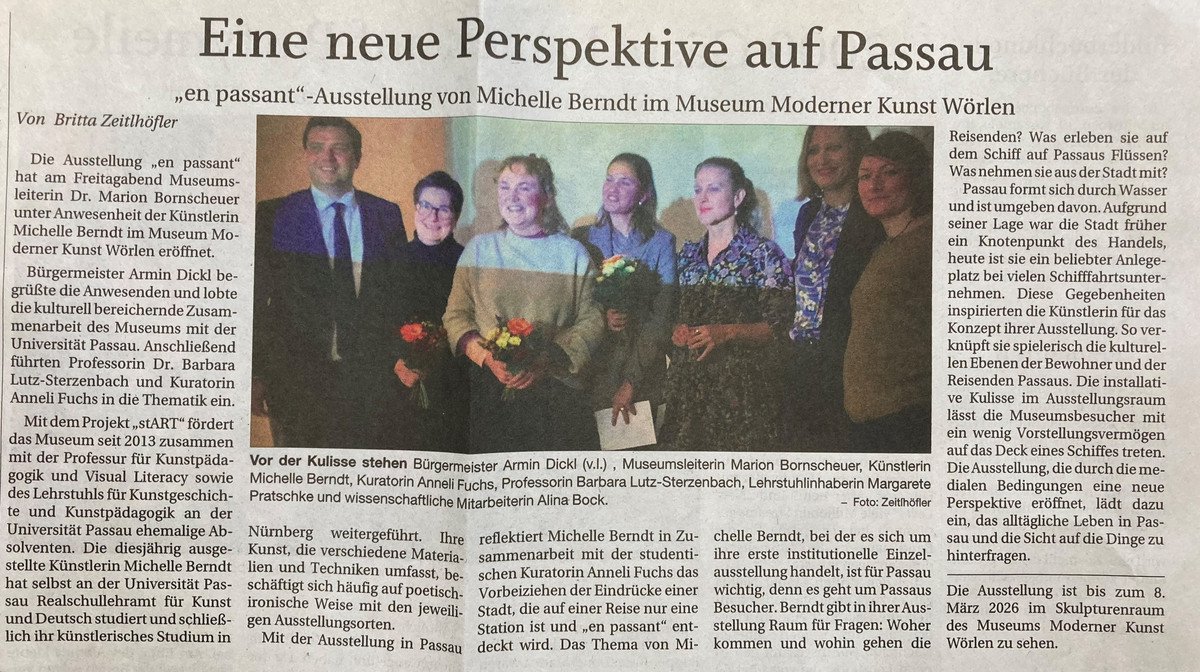 Unter dem Namen „stART“ fördern die Professur für Kunstpädagogik und Visual Literacy, der Lehrstuhl für Kunstgeschichte und Bildwissenschaft sowie das Museum Moderner Kunst Wörlen Passau Absolventinnen und Absolventen der Kunstpädagogik an der Universität Passau. In der diesjährigen Ausstellung reflektiert Michelle Berndt über das Vorbeiziehen der Eindrücke der Stadt Passau. Diese bildet auf einer Reise vielleicht nur eine Station und wird „en passant“ entdeckt. Die Künstlerin verknüpft auf charmante und humorvolle Art zwei Perspektiven: die der BewohnerInnen der Stadt und die der TouristInnen. Mit ihrer installativen Kulisse lässt sie BesucherInnen der Ausstellung in die Rolle der Reisenden schlüpfen.