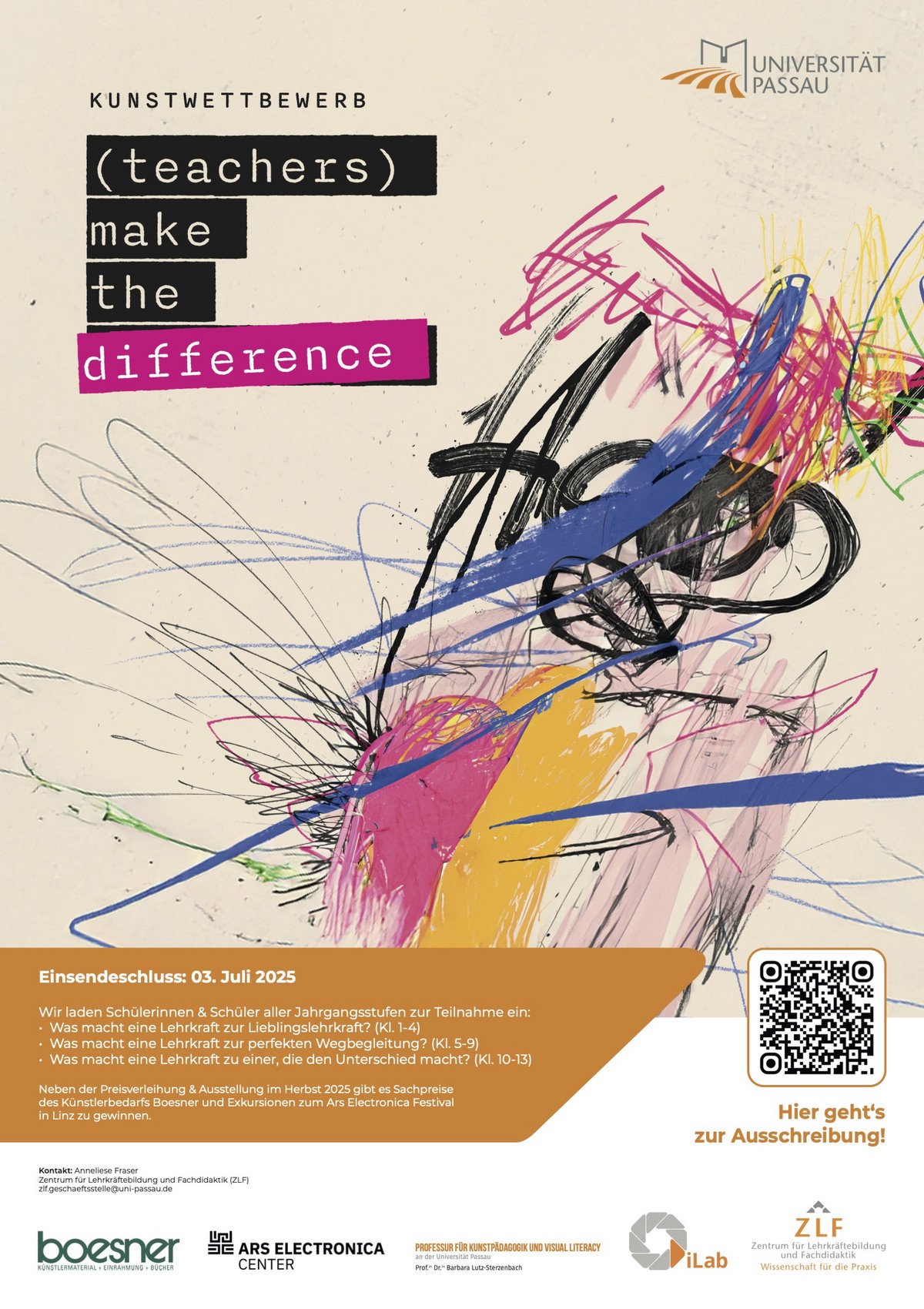 Schulen aus ganz Bayern sind eingeladen, sich an einem innovativen Kunstwettbewerb zu beteiligen, der die Zukunft der Bildung ins Visier nimmt. Organisiert wird der Wettbewerb vom Zentrum für Lehrkräftebildung und Fachdidaktik der Universität Passau (ZLF) in Zusammenarbeit mit der Professur für Kunstpädagogik und Visual Literacy (Prof. Dr. Barbara Lutz-Sterzenbach), dem Ars Electronica Center in Linz sowie dem Künstlerbedarf boesner. Ziel ist es, kreative Visionen von Schülerinnen und Schülern zu fördern und zu zeigen, wie die „Bildung der Zukunft“ gestaltet werden kann.