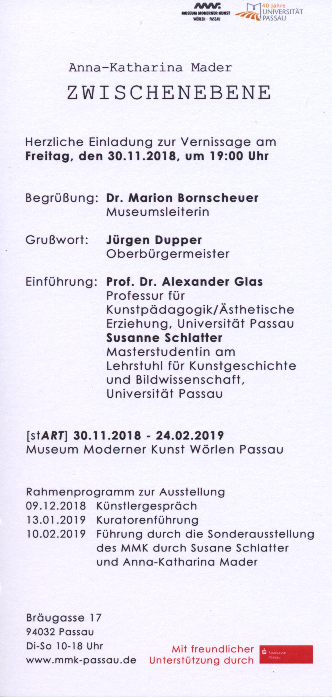 Vernissage: 30. November 2018 - 19:00 Uhr, Museum Moderner Kunst Wörlen Passau