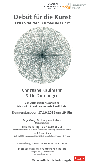 Mit dem Programm "Debüt für die Kunst. Erste Schritte zur Professionalität" fördert das Museum Moderner Kunst Wörlen und der Lehrstuhl für Kunstpädagogik/Ästhetische Erziehung der Universität Passau seit 2013 Absolventen des Studiengangs "Kunst". Erstmals wurde das Projekt in diesem Jahr auch vom Lehrstuhl für Kunstgeschichte/Bildwissenschaften kuratorisch begleitet. In den kommenden Jahren soll auf diesem Weg Studierenden die Möglichkeit eröffnet werden, Erfahrungen in Planung und Durchführung einer Ausstellung zu sammeln. Mit Christiane Kaufmann wurde 2016 eine Künstlerin gewonnen, die nach Abschluss ihres Studiums der Kunsterziehung und Germanistik in Passau und als Meisterschülerin von Prof. Thomas Hartmann an der Akademie der Bildenden Künste in Nürnberg, bereits seit längerem freischaffend tätig ist. Sie lebt und arbeitet derzeit in Aschaffenburg.