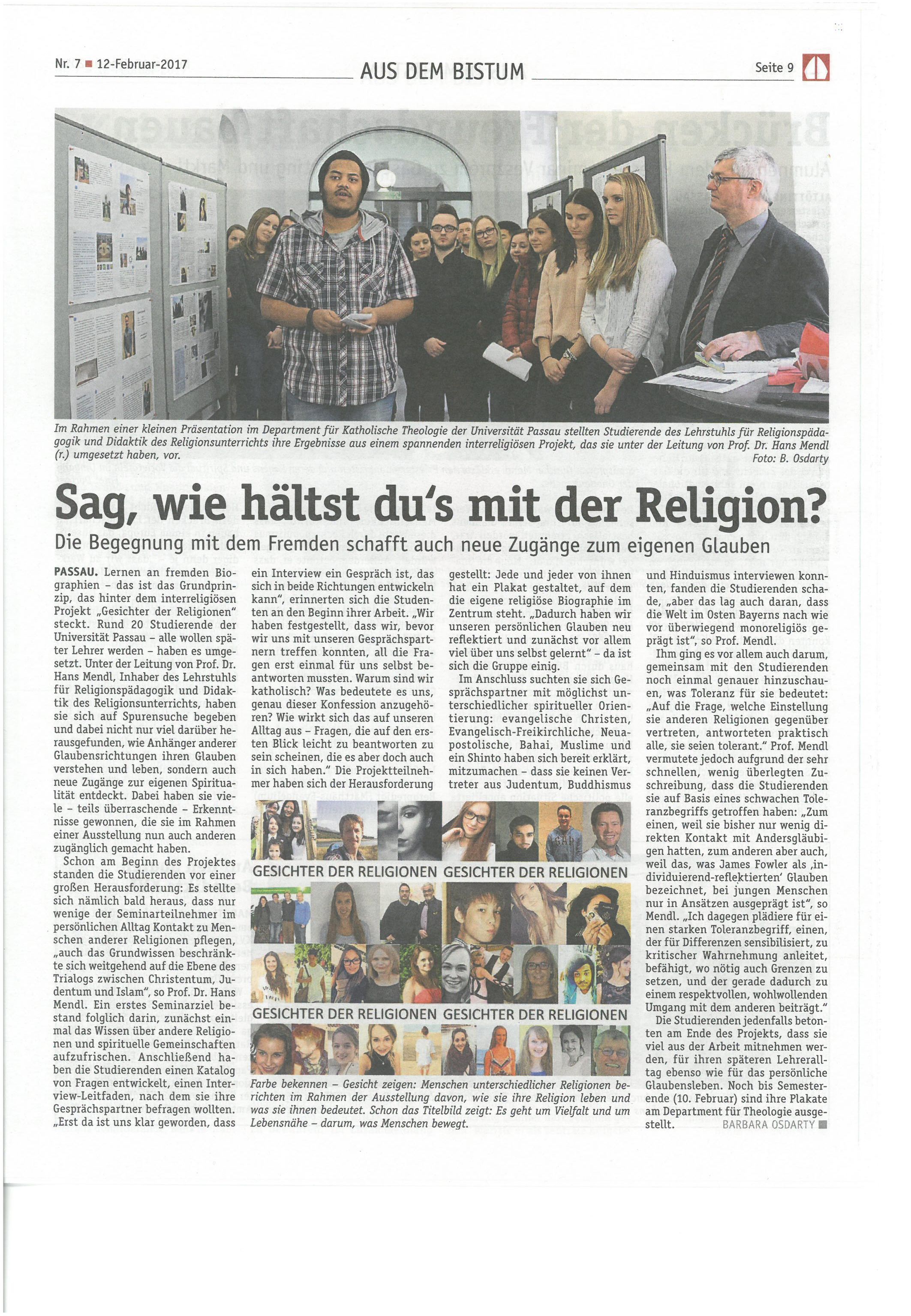 Im Rahmen eines religionspädagogischen Seminars am Department für Katholische Theologie ist eine Ausstellung mit dem Titel „Gesichter der Religionen“ entstanden. Das Ziel bestand darin, Menschen aus dem Großraum Passau bzw. aus der Heimatregion unserer Studierenden mit Text und Bildern zu porträtieren – Menschen, denen ihre Religion und ihr Glaube etwas bedeuten. Wir lehnen uns dabei an ein Ausstellungsprojekt aus Niedersachsen an (www.gesichter-der-religionen.de). Die Studierenden haben jeweils ein Mitglied einer anderen Religion interviewt und auf dieser Basis eine Ausstellungstafel, das „Gesicht der Religion“ zur Person, erstellt.