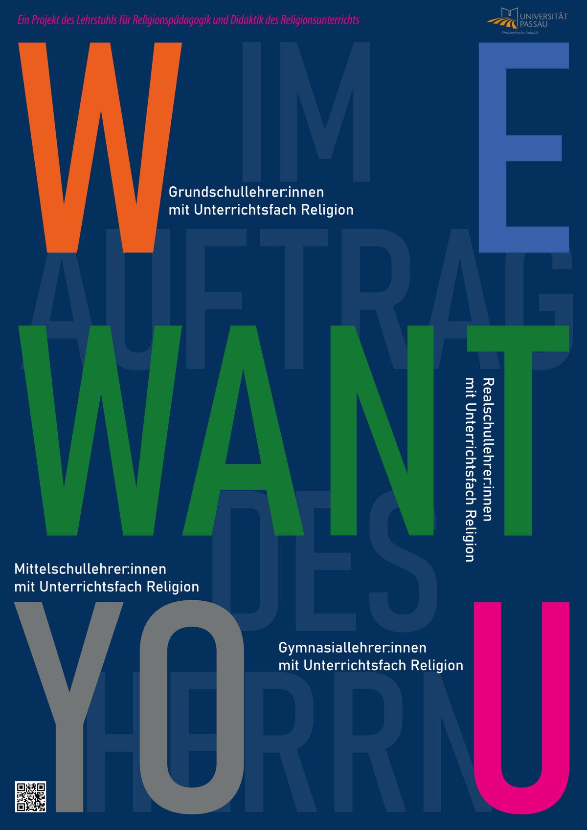 „Im Auftrag des Herrn“, frei nach den Blues Brothers, so lautete der Titel eines Seminars, bei dem diese Ausstellungsplakate entstanden sind: Junge Lehrkräfte und Studierende werden porträtiert; sie geben Auskunft, wieso sie Religion unterrichten bzw. sie sich für ein Lehramtsstudium mit dem Fach Theologie entschieden haben. Alle Schularten, die an unserem Lehrstuhl studiert werden können, sind vertreten: Grundschule, Mittelschule, Realschule und Gymnasium.