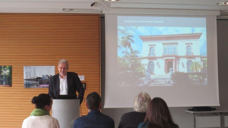 Nach einer Pause, bei der sich alle bei hausgemachten kubanischen Spezialitäten wie Kokosmilchreis, Feenküchlein und dem Süßkartoffeldessert cafiroleta stärken konnten, berichtete Prof. Dr. Burkhard Freitag von seinem Forschungssemester auf Kuba, dessen Schwerpunkt auf einem Programm zur Dokumentation räumlicher Objekte lag, z. B. von Gebäuden, die zum UNESCO-Weltkulturerbe zählen.