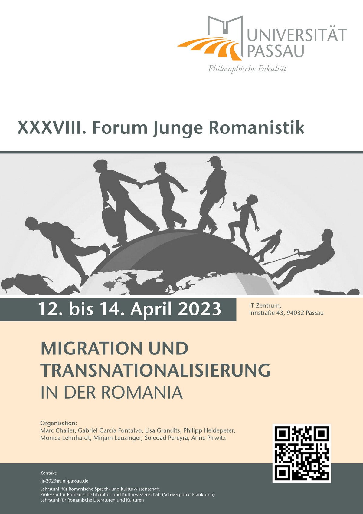 Das Forum Junge Romanistik ist die jährlich stattfindende Nachwuchstagung der deutschsprachigen Romanistik. Der Passauer romanistische Nachwuchs organisiert das 38. Forum unter dem Rahmenthema Migration und Transnationalisierung. Es findet vom 12. bis zum 14. April 2023 unter dem Dach des Deutschen Romanistenverbandes an der Universität Passau statt.