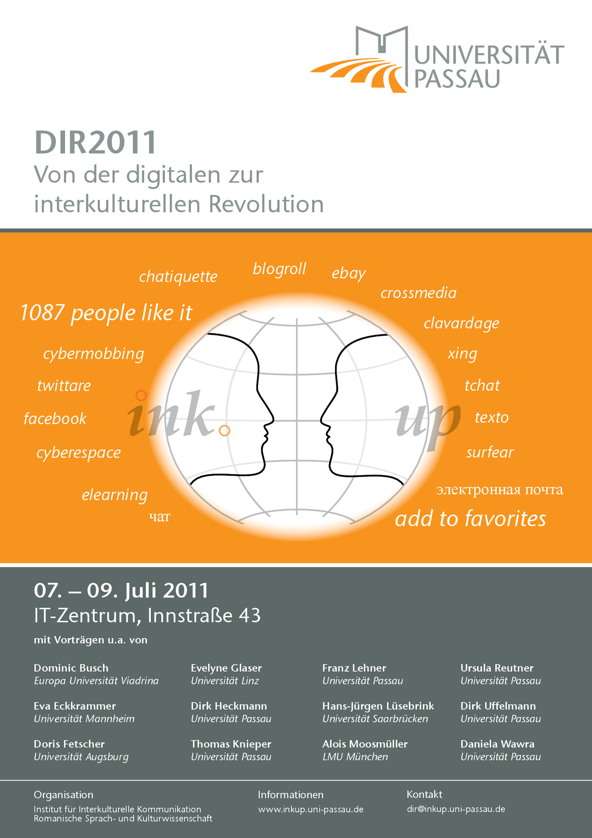Der Lehrstuhl für Romanische Sprach- und Kulturwissenschaft und das Institut für Interkulturelle Kommunikation laden vom 7. bis zum 9. Juli 2011 zur Tagung DIR2011 "Von der digitalen zur interkulturellen Revolution" ins ITZ ein. Drei Themenblöcke stehen im Zentrum der Tagung: Der Komplex Teams & Kollektive gilt der interkulturellen Kommunikation in virtuellen Gruppen und Arbeitsteams. Die Beiträge zu Identität & Persönlichkeit behandeln die Konsequenzen des Medienwandels auf die Art der Selbstpräsentation und individuellen Kommunikation. Die Referenten zu Zensur & Selbstzensur analysieren rechtliche Fragen und interessengeleitete Darstellungen.