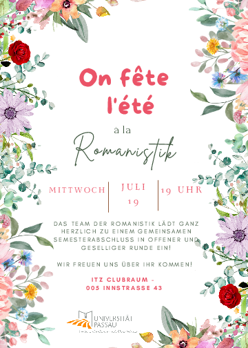Wir feiern den Sommer à la Romanistik. Alle Studierenden und Wegbegleiter der Romanistik sind herzlich zum Semesterabschluss am 19. Juli ins ITZ 5 eingeladen.