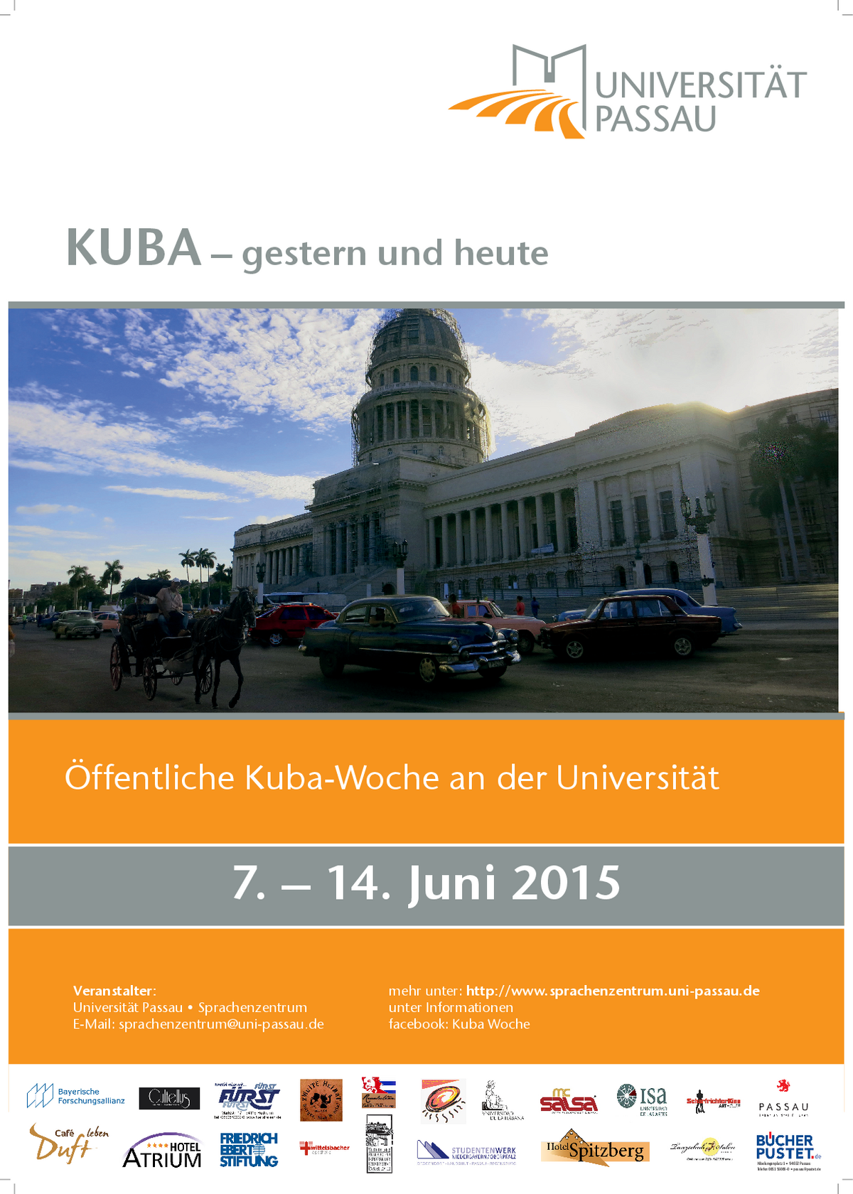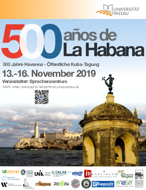 Zu diesem Anlass veranstaltet das Spanisch-Team des Sprachenzentrums der Universität Passau eine Kuba-Tagung, zu der wir Sie herzlich einladen. Vom 13. bis zum 16. November gibt es verschiedene Vorträge mit anschließender Diskussion, zudem einen Workshop zu kubanischen Tänzen, eine Fotoausstellung sowie einen Spanisch-Stammtisch.