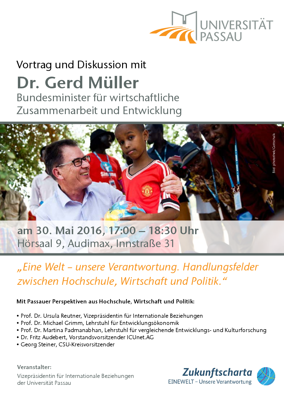 Die Vizepräsidentin für Internationale Beziehungen und der Lehrstuhl für Romanische Sprach- und Kulturwissenschaft laden zum Vortrag von Dr. Gerd Müller, Bundesminister für wirtschaftliche Zusammenarbeit und Entwicklung, ein. Er spricht am 30. Mai 2016 an der Universität Passau zum Thema "Eine Welt - unsere Herausforderung". Im Anschluss werden entwicklungspolitische Handlungsfelder zwischen Hochschule, Wirtschaft und Politik diskutiert.