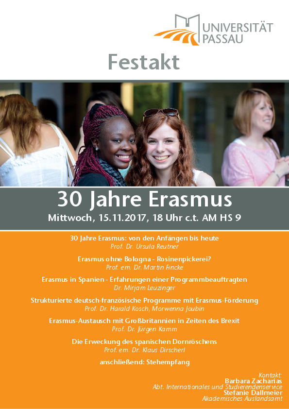 Das Akademische Auslandsamt und der Lehrstuhl für Romanische Sprach- und Kulturwissenschaft laden am 15. November 2017 um 18 Uhr zum Festakt "Dreißig Jahre Erasmus" ins AM HS 9 ein. Wir blicken zurück auf die Geschichte des Programms in Europa wie in Passau: von unseren ersten Erasmus-Kontakten mit Toulouse und Málaga bis hin zu Erasmus in Zeiten des Brexit. Im Anschluss gibt es einen kleinen Empfang.