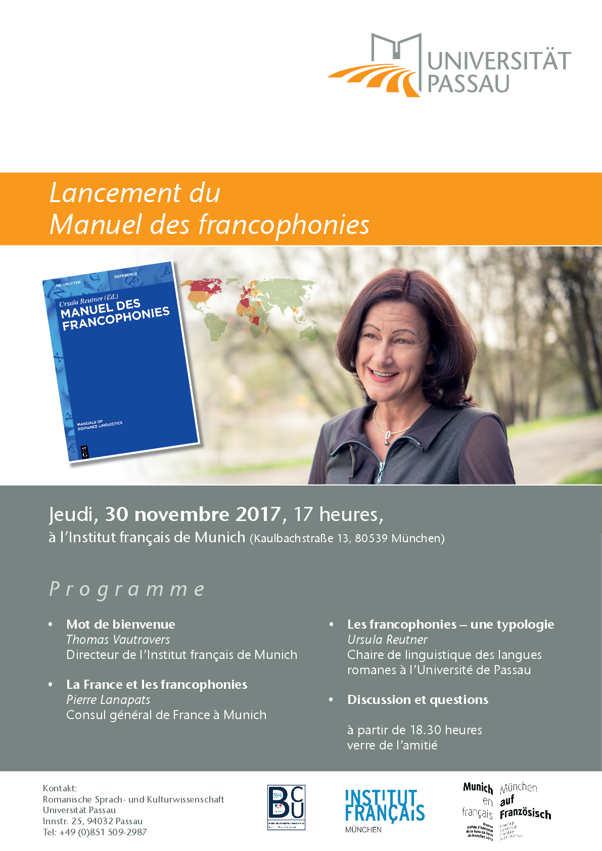 Das Institut français in München und der Lehrstuhl für Romanische Sprach- und Kulturwissenschaft laden am Donnerstag, den 30. November 2017, ins Palais des Seyssel d'Aix zur Präsentation des Manuel des francophonies ein, der ersten umfassenden Darstellung der Sprachensituation in frankophonen Ländern nach einheitlichen Kriterien und einheitlicher Struktur. Nach Grußworten des Institutsdirektors Thomas Vautravers und des Generalkonsuls Pierre Lanapats wird Frau Prof. Reutner das Buch vorstellen. Im Anschluss besteht die Möglichkeit, Fragen zu stellen und an einem Umtrunk teilzunehmen.