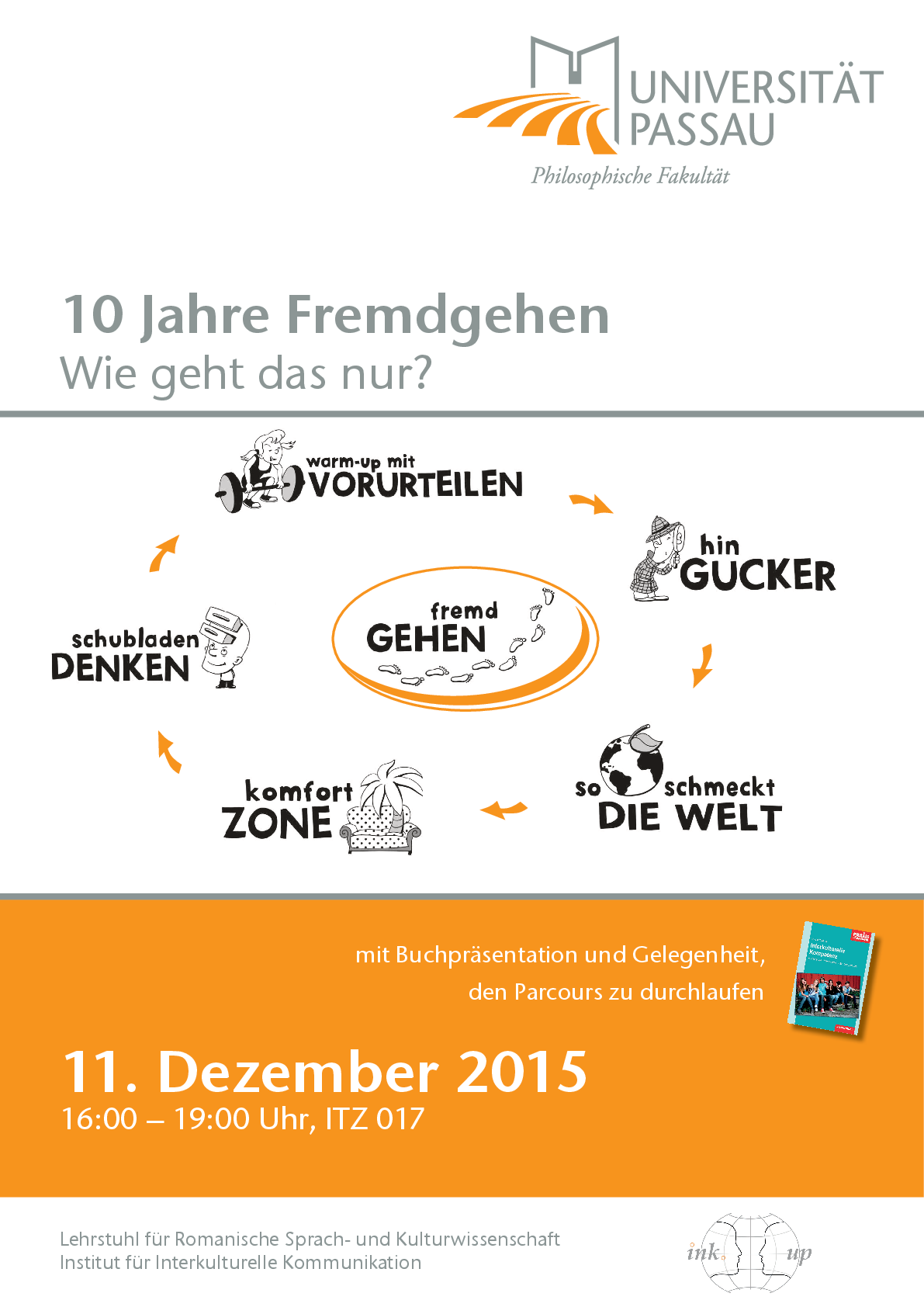 Der Lehrstuhl für Romanische Sprach- und Kulturwissenschaft und das Institut für Interkulturelle Kommunikation laden zur Festveranstaltung "10 Jahre Fremdgehen - wie geht das nur?" am 11. Dezember 2015 um 16:00 Uhr ins ITZ 017 ein. Es wird ein Einblick in den interaktiven Fremdgänger-Parcours geboten und das neu erschienene Buch Anleitung zum Fremdgehen präsentiert.