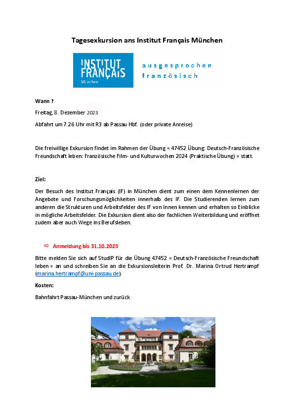 Bei Interesse an der freiwilligen Exkursion, melden Sie sich bitte bis spätestens 31. Oktober 2023 bei der Exkursionsleiterin Prof. Dr. Marina Ortrud Hertrampf (marina.hertrampf@uni-passau.de) an und schreiben sich zusätzlich auf StudIP für die Übung 47452 « Deutsch-Französische Freundschaft leben » ein.